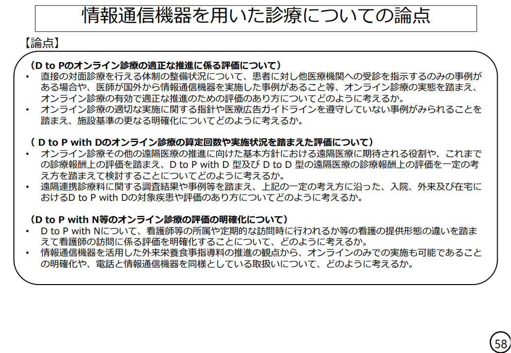 さてそんな状況ですが、どうにかこうにはオンライン診療を進めていきたいという国の方針ですが、11月7日に開催された中央社会保険医療協議会「外来その3」でオンライン診療について議論されています。