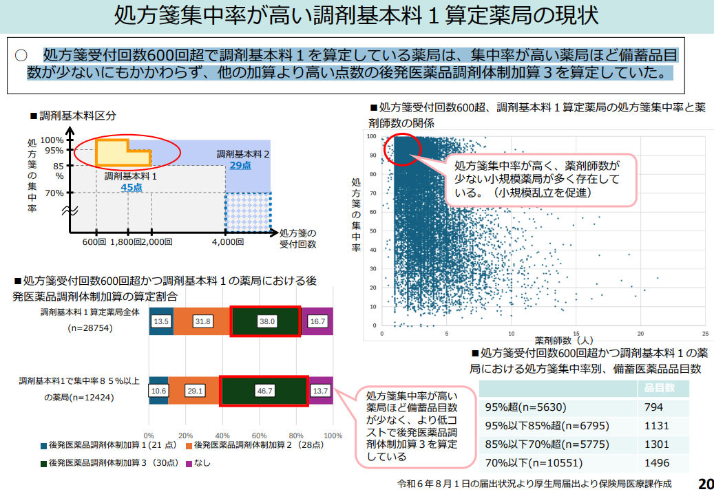 「処方箋受付回数600回超で調剤基本料1を算定している薬局は、集中率が高い薬局ほど備蓄品目数が少ないにもかかわらず、他の加算より高い点数の後発医薬品調剤体制加算3を算定していた。」